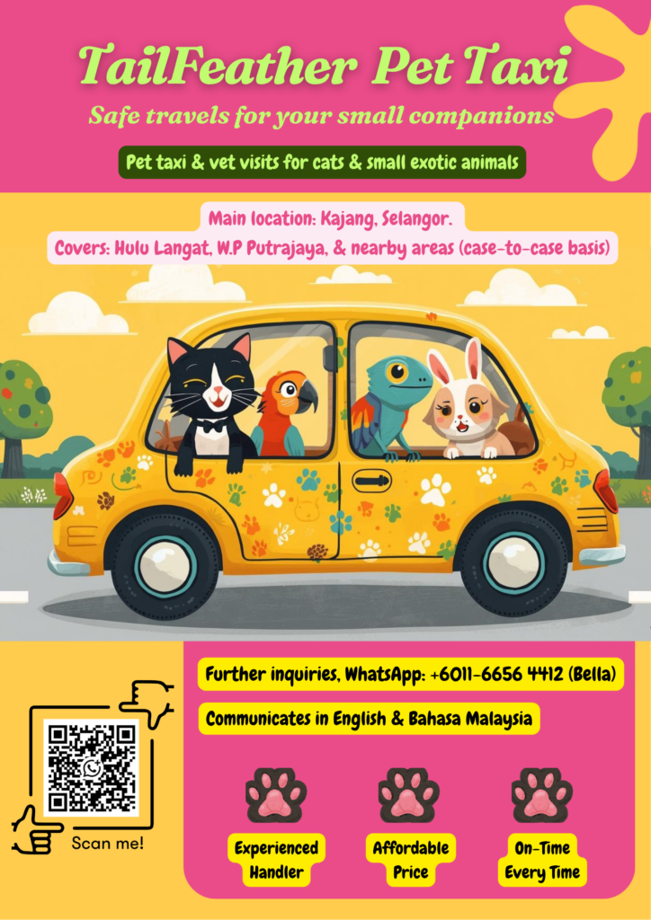 TailFeather Pet Taxi is a pet transportation service operating around Hulu Langat, Bangi, Putrajaya, Cyberjaya, and the surrounding areas. The service focuses on cats and small exotic pets (such as rabbits, guinea pigs, birds, chinchillas, and other small animals) — ensuring they receive gentle, calm, and attentive handling throughout their journey. We understand that your pets are family. That’s why TailFeather Pet Taxi provides:
